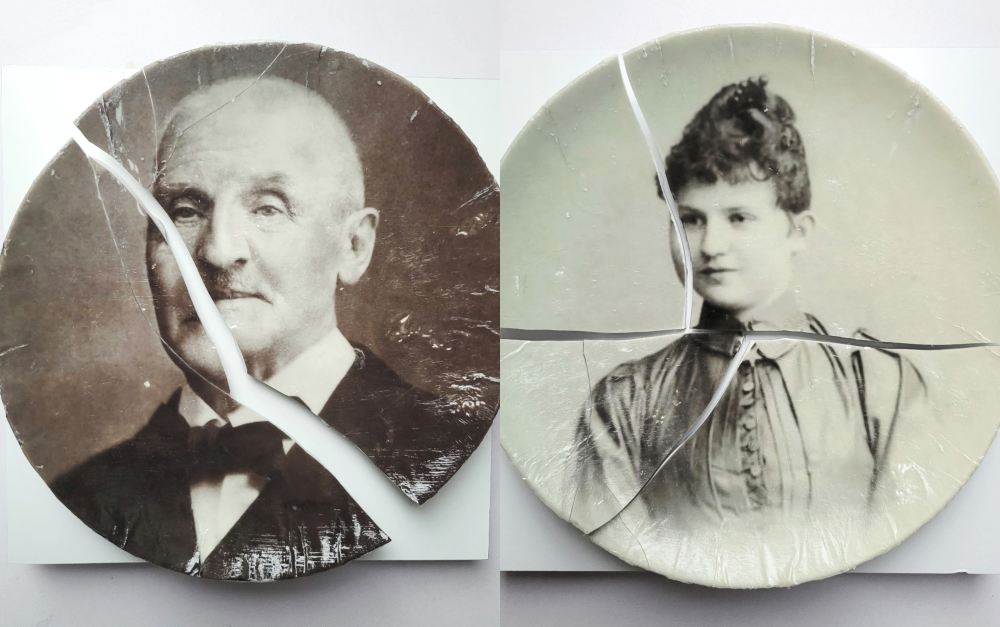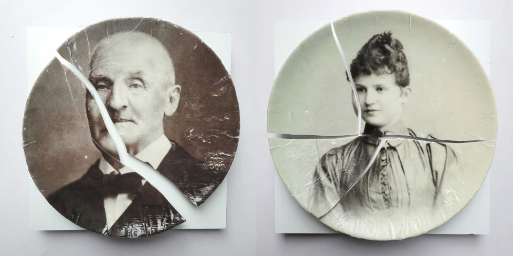"Es ist angerichtet", 2024, Transferdruck auf Porzellan, Alu-Dibond, je 20 x 20 cm