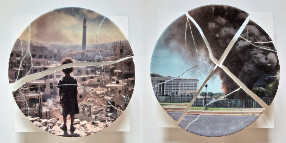 Michael HuM-ART Sardelic,  "Es ist angerichtet",2024, Transferdruck auf Porzellan, Alu-Dibond, je 20 x 20 cm